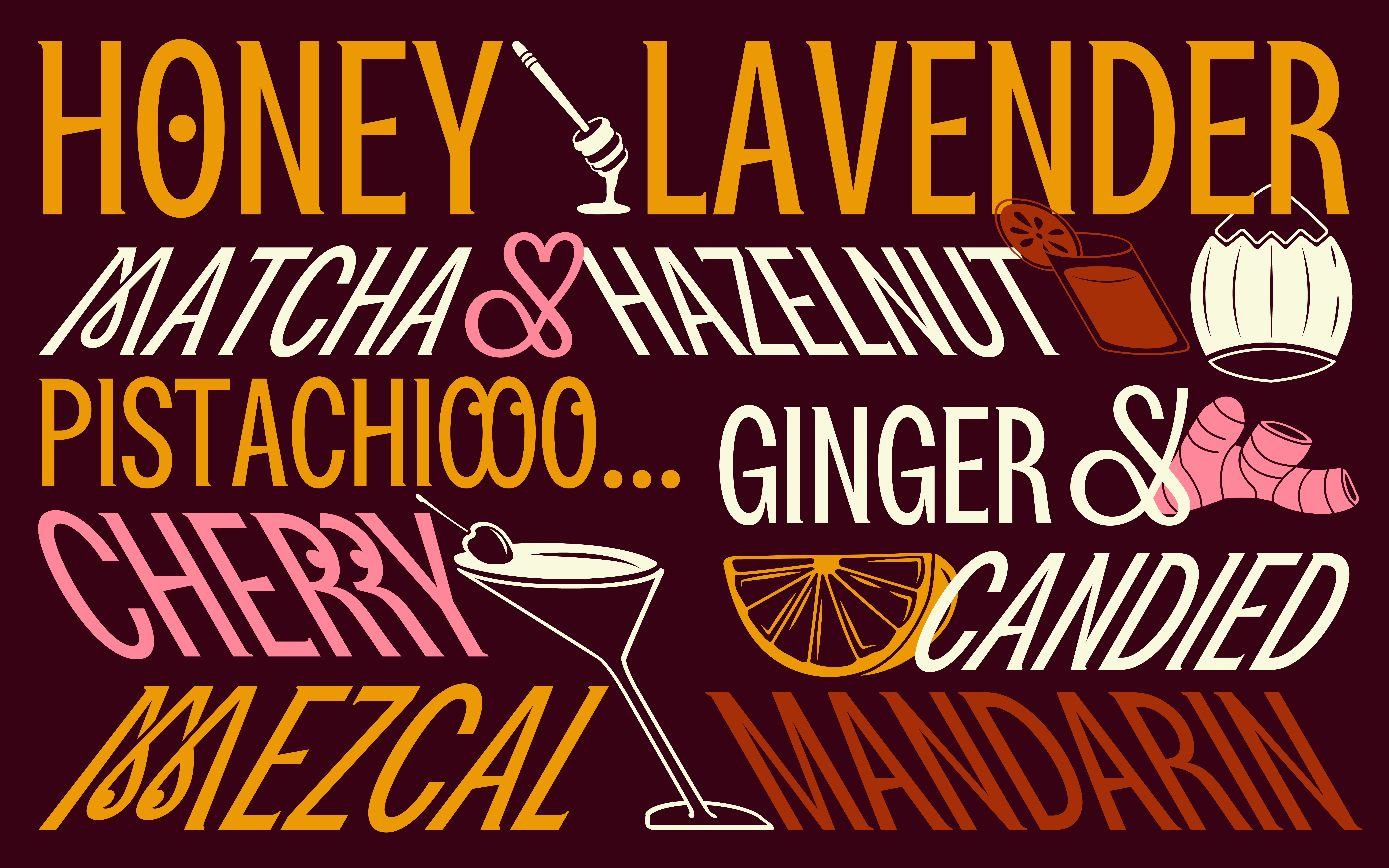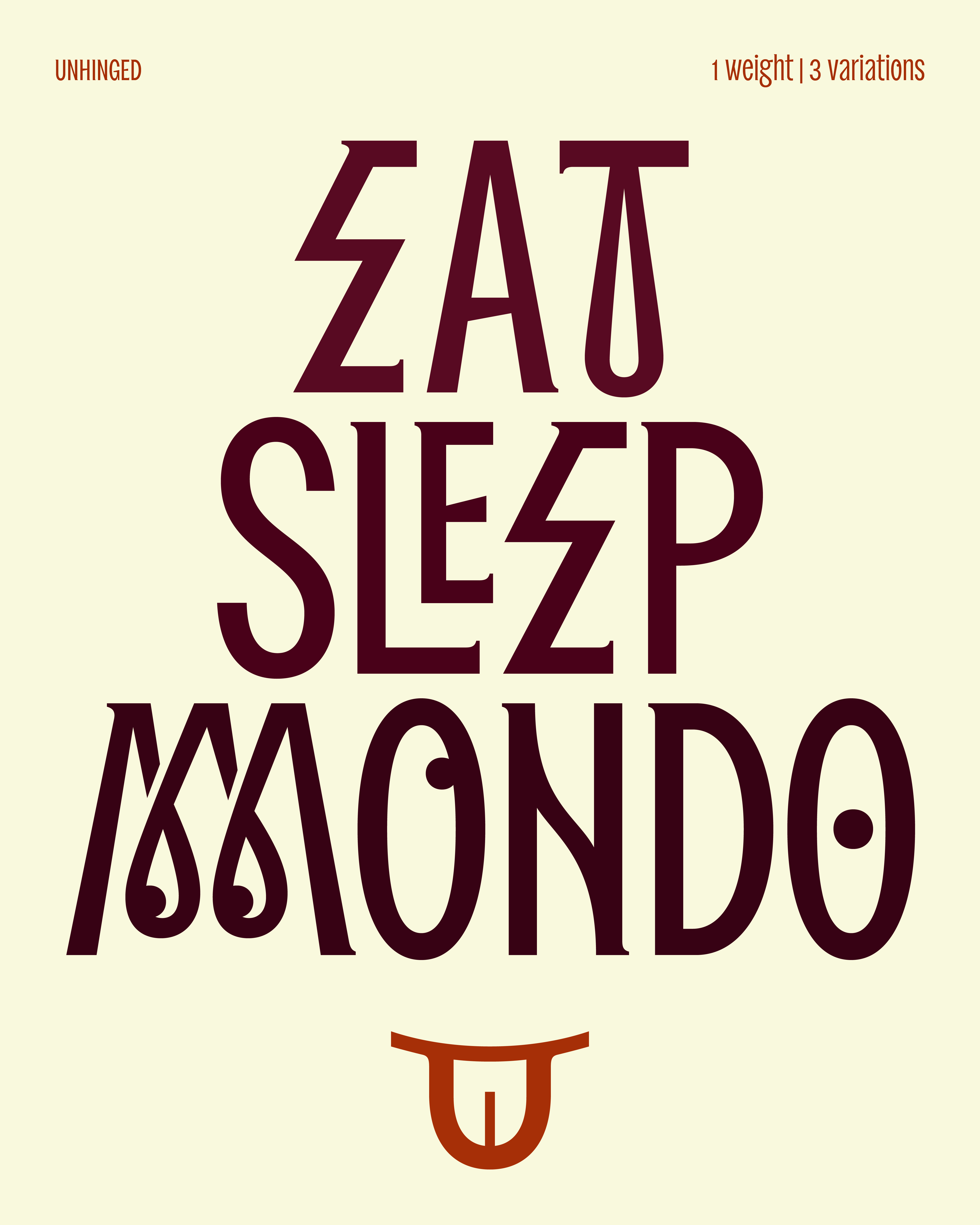Somewhere between the melting scoops and serotonin-spiked doodles, a custom mixed-serif typeface named Unhinged holds court with theatrical confidence. Is it serif or sans? It has existential crisis.