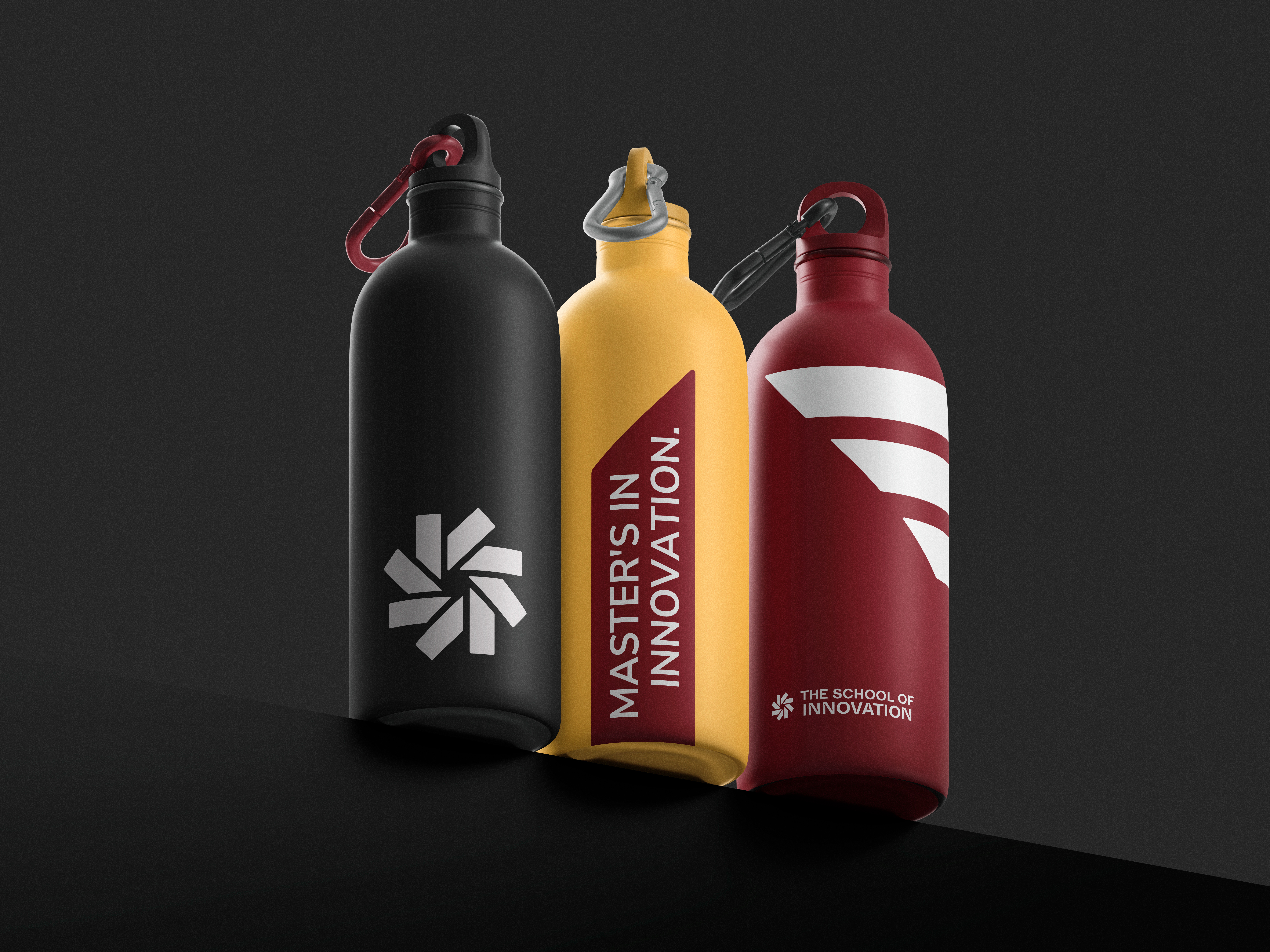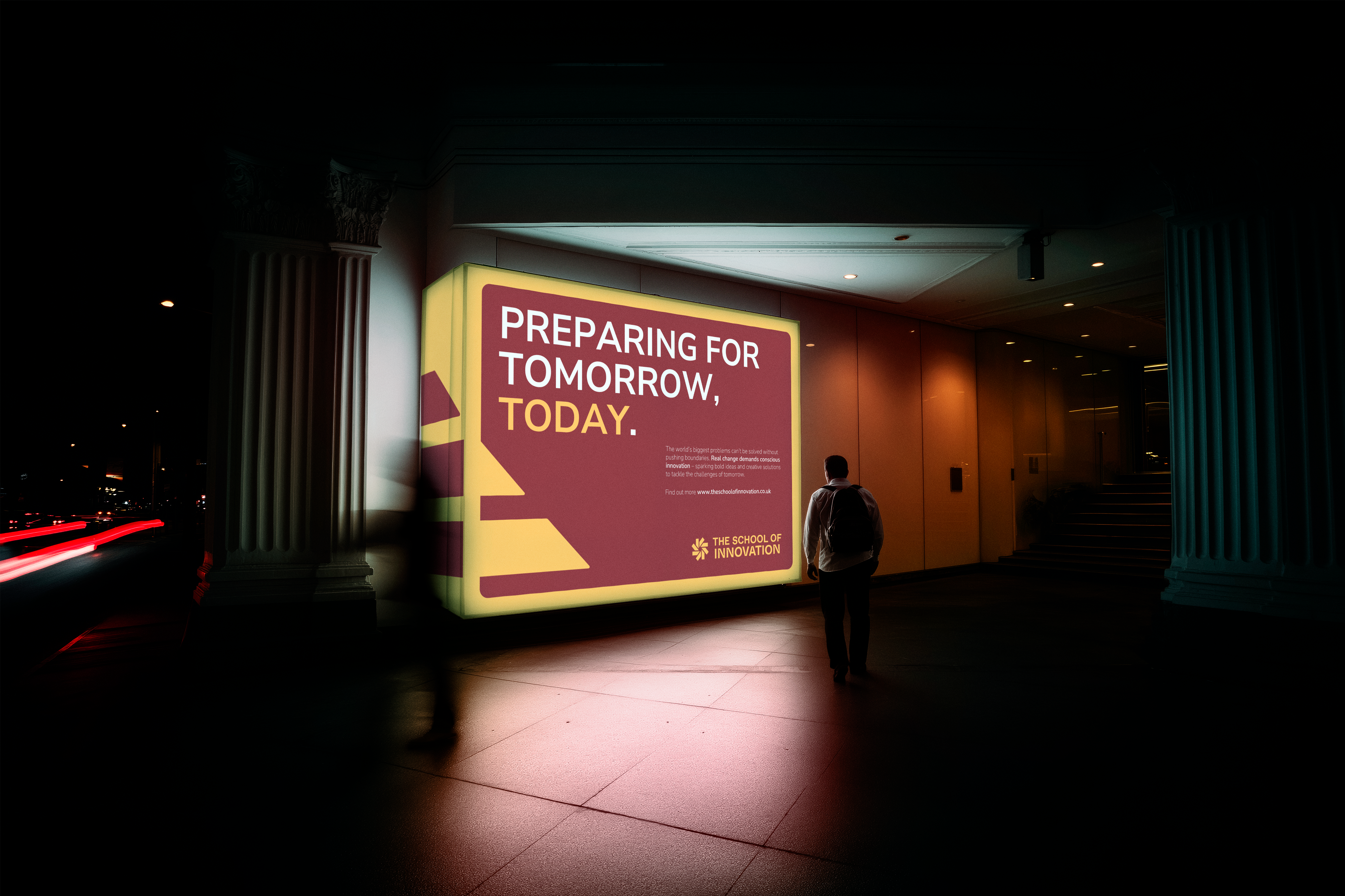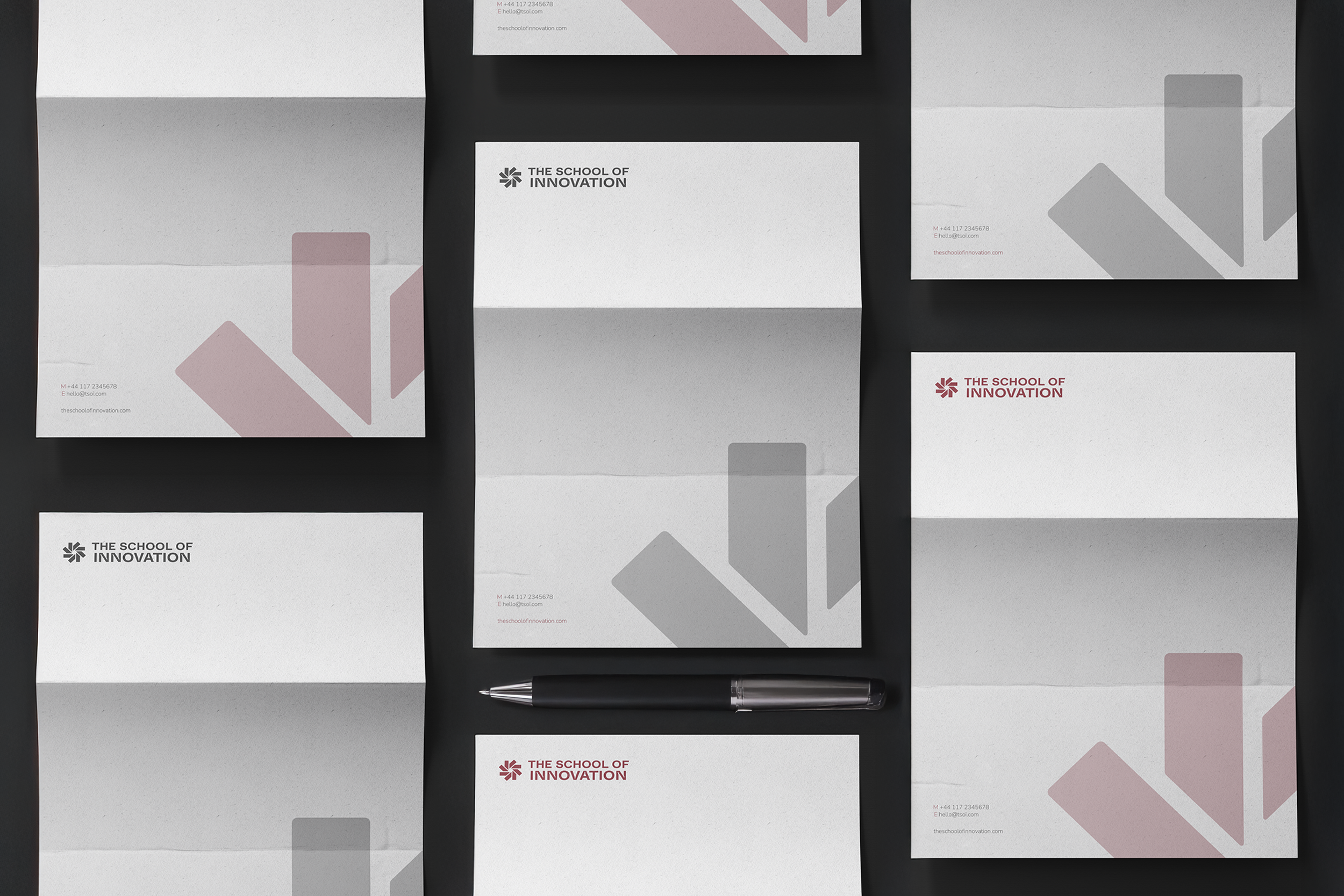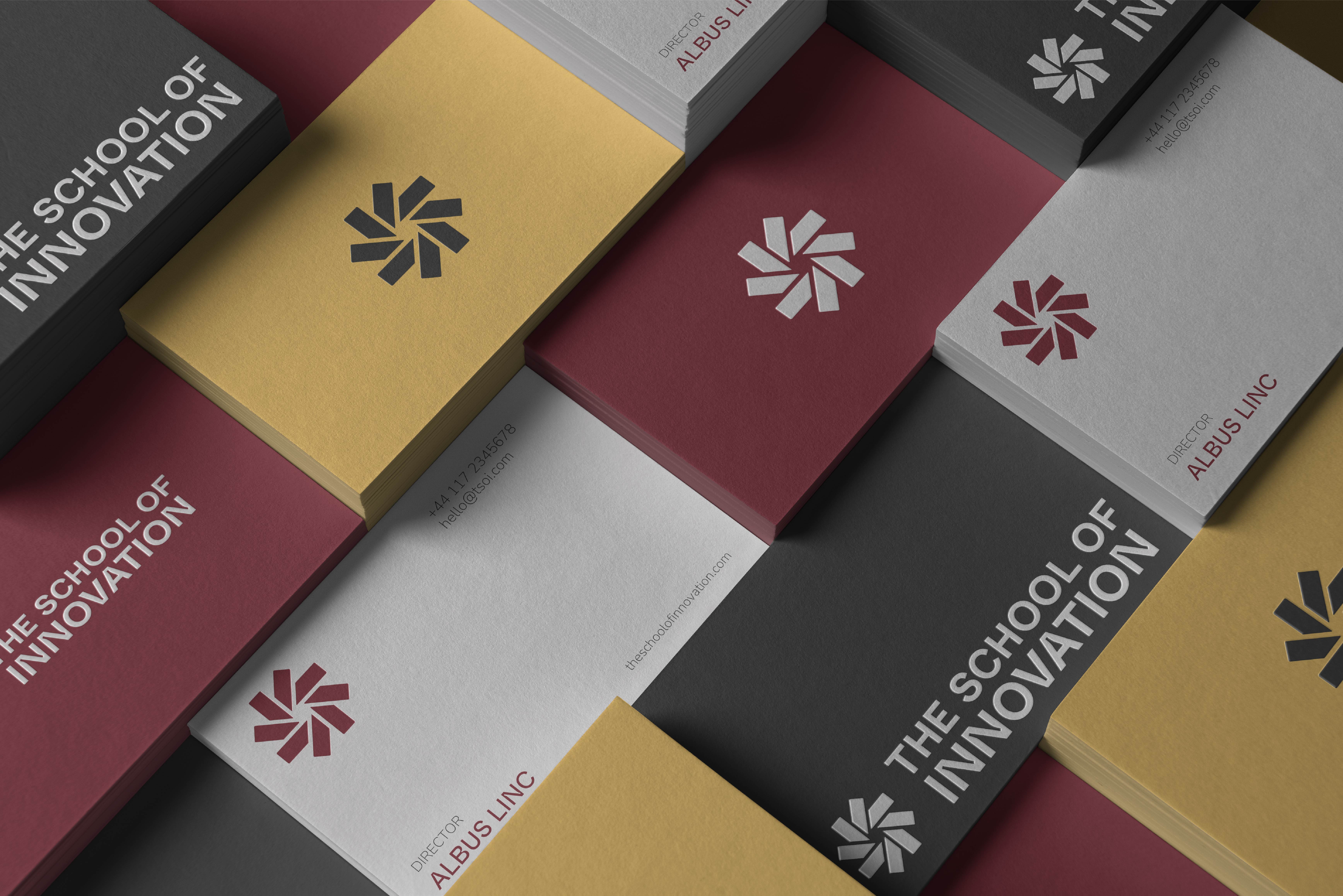 The brand identity translates these principles into a cohesive visual system. The symmetrical logomark is constructed from eight identical forms, directly referencing the Eight Pillars while symbolising equity, community, and collective momentum. The circular composition reinforces the idea of continuous iteration—progress without a fixed endpoint. An ink-trap logotype introduces a sense of movement and craft, balancing institutional credibility with contemporary dynamism. Departing from conventional academic colour codes, a bold and unconventional palette establishes a distinctive, confident presence—positioning The School of Innovation as impact-driven, timeless, and unapologetically forward-looking.
